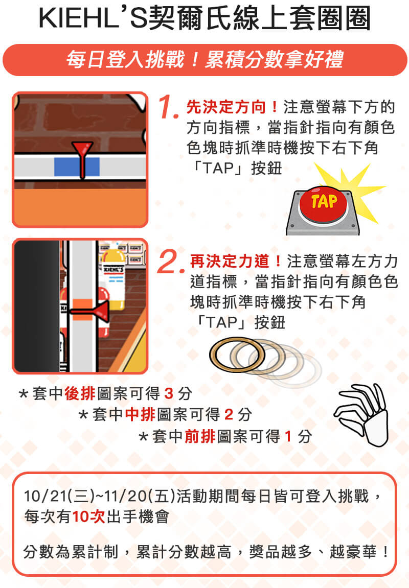 *分數統計時間:2020/10/21(三)至2020/11/20(五)止,符合贈品兌換資格者,將於透過KIEHL’S契爾氏官方LINE帳號寄送兌換券給您
